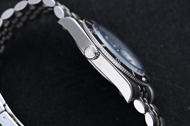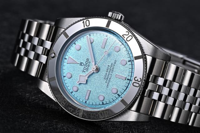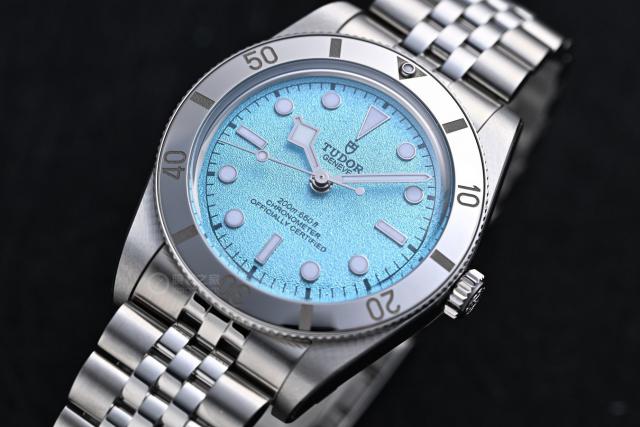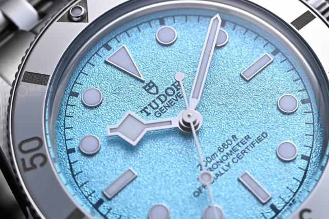這款表最大亮點(diǎn)就是“極境藍(lán)”表盤。藍(lán)色對勞力士和帝舵來說是高階顏色,勞力士藍(lán)盤專業(yè)蠔式不沾金很難買到,近似蒂芙尼藍(lán)的綠松石藍(lán)色蠔式恒動(dòng)更是天價(jià)。而“極境藍(lán)”既不像綠松石藍(lán)那么淡,也不像火烈鳥藍(lán)那么艷,更不像冰藍(lán)那么冷。這個(gè)藍(lán)色讓人看后心里舒朗,搭配出眾的顆粒紋質(zhì)感,越看越松弛、平靜、清爽!另外,為適配這討喜的藍(lán)色,“雪花”指針和鑲嵌時(shí)標(biāo)不再走復(fù)古路線,采用精致的鏡面拋光處理,并覆以白色夜光涂層。