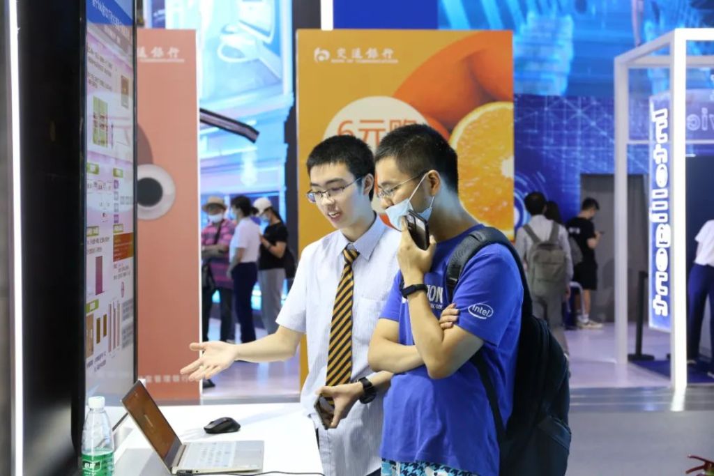 盧高畢業(yè)生黃瀚洋(左)在2021世界人工智能大會(huì)上向觀眾展示項(xiàng)目成果。
