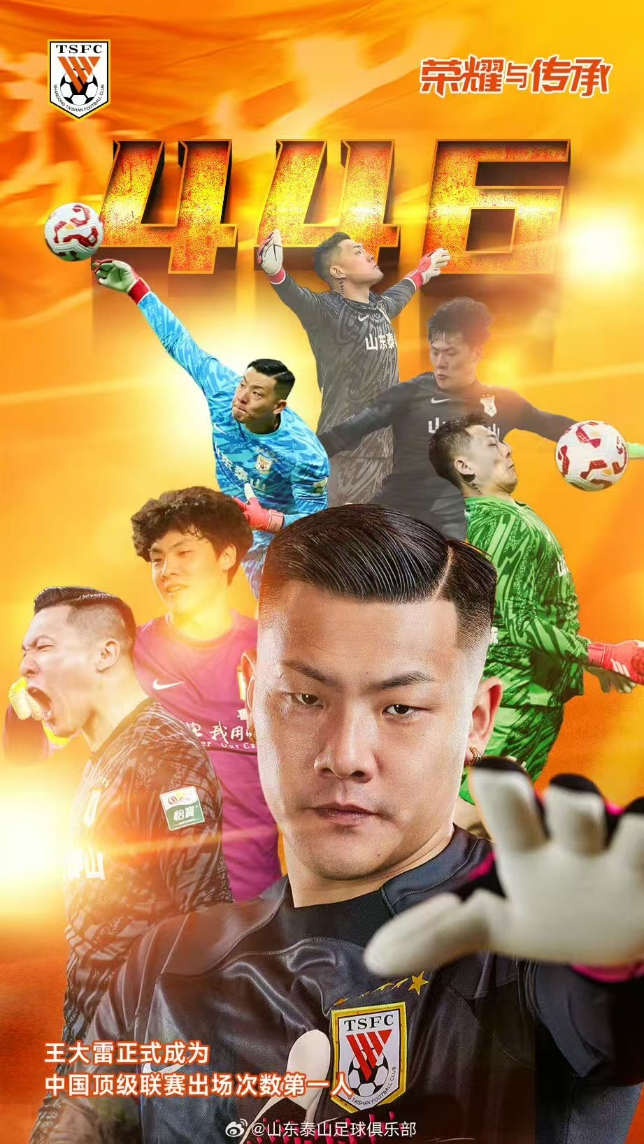 36歲的王大雷自2006年起,代表上海聯(lián)城、上海申花和山東泰山征戰(zhàn)中超,至今已出戰(zhàn)446場。泰山官方發(fā)布海報,祝賀王大雷達(dá)成這一成就。