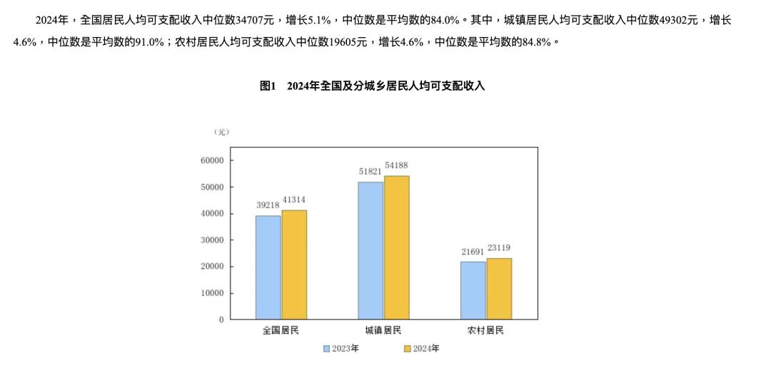 從收入來看,國家統(tǒng)計(jì)局?jǐn)?shù)據(jù)顯示,城鎮(zhèn)居民2024年人均可支配收入中位數(shù)為49,302元,鄉(xiāng)鎮(zhèn)居民為19,605元。