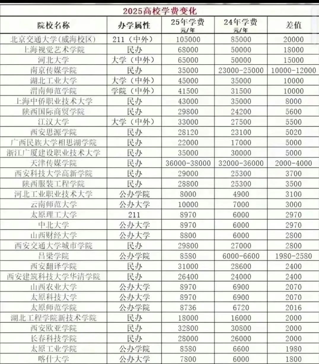 而且學(xué)費(fèi)漲幅還不小。據(jù)統(tǒng)計(jì),2025年超幾十所大學(xué)學(xué)費(fèi)上漲,漲幅在500 - 20000元/年不等。