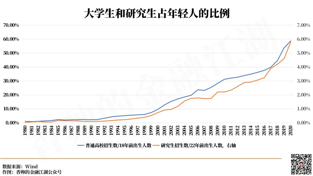 也就是說,3個年輕人里差不多有2個是大學(xué)生,15個年輕人里有1個是研究生。