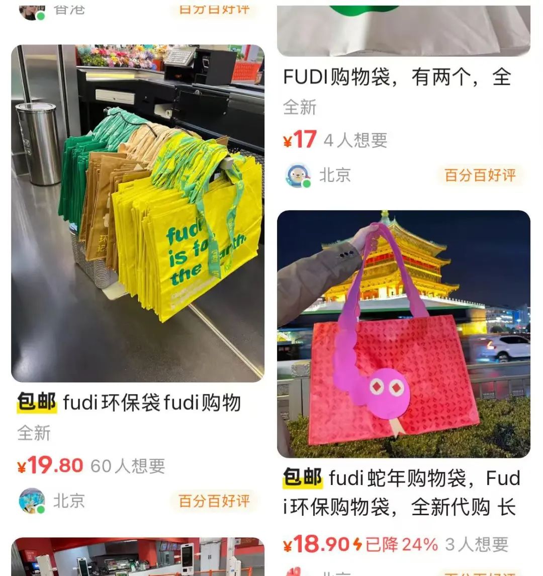FUDI的環(huán)保購物袋甚至成了閑魚上售價(jià)20元的網(wǎng)紅周邊。如今,超市也需要為年輕人提供情緒價(jià)值,才能成為網(wǎng)紅超市。