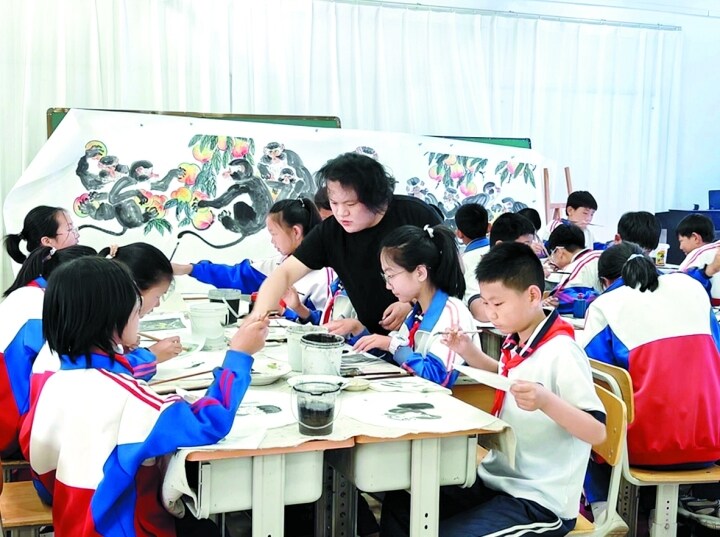在畫社里,彭燁系統(tǒng)地教授國畫、書法和篆刻等傳統(tǒng)藝術(shù)。隨著課程的深入,一批有天賦的孩子逐漸嶄露頭角。她讓這些孩子擔(dān)任“小老師”上臺示范,課間帶著大家用畫筆美化校園墻壁,把空白的墻壁變成“童話森林”;課余時間組織孩子們布置展室,陳列“兒童生活水墨”“鄉(xiāng)土篆刻”等作品。