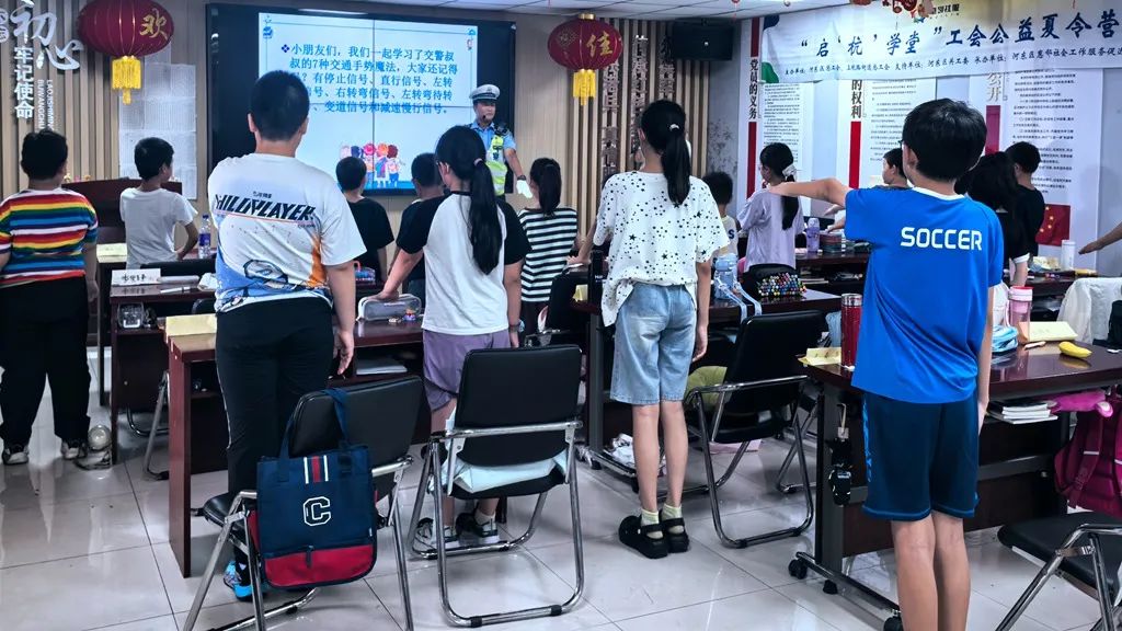 在“交通指揮大練兵”環(huán)節(jié),交警在“小交警”隊伍中來回走動,逐個調(diào)整孩子們的手勢角度,并提醒他們:“動作要干脆利落,讓交通參與者能看清咱們的指揮信號?!?/p>