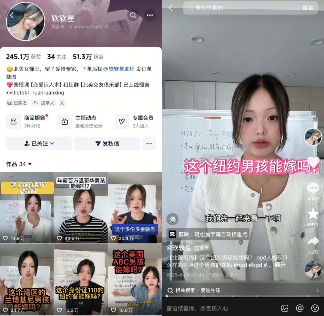 值得注意的還有海外留學(xué)生的高端狙擊。@軟軟星 深耕北美留子圈層,破解“綠卡陷阱”、“信托基金話術(shù)”等高端局密碼。垂直化內(nèi)容助推她短短時(shí)間在抖音漲粉超過了20萬,印證了克勞銳總經(jīng)理張宇彤發(fā)表過的對(duì)行業(yè)的判斷:內(nèi)容垂直細(xì)分是突破同質(zhì)化的核心路徑,代際差異使Z世代在小眾圈層形成強(qiáng)歸屬感。