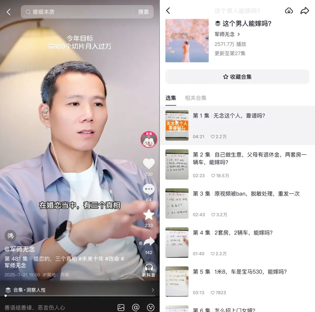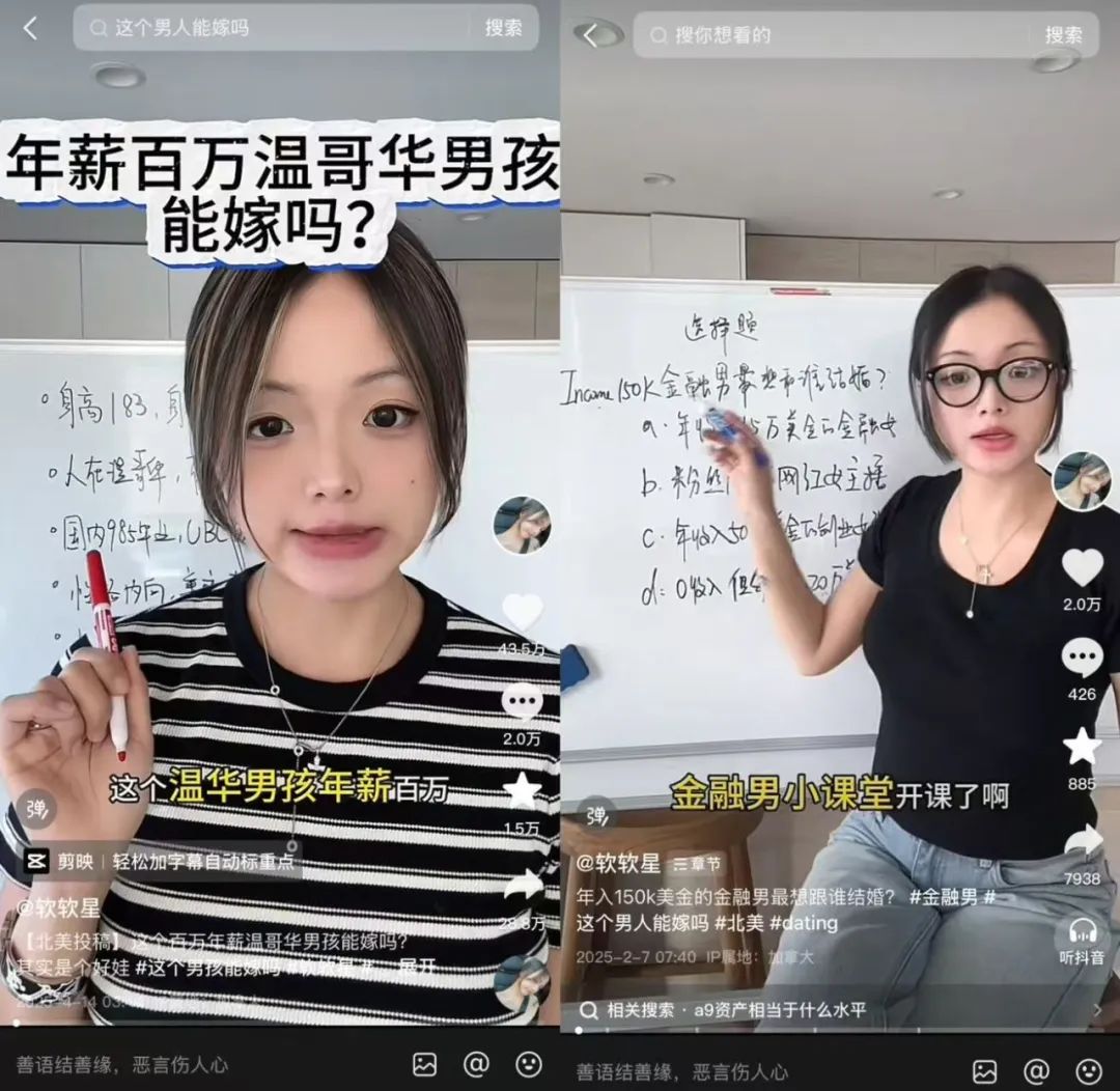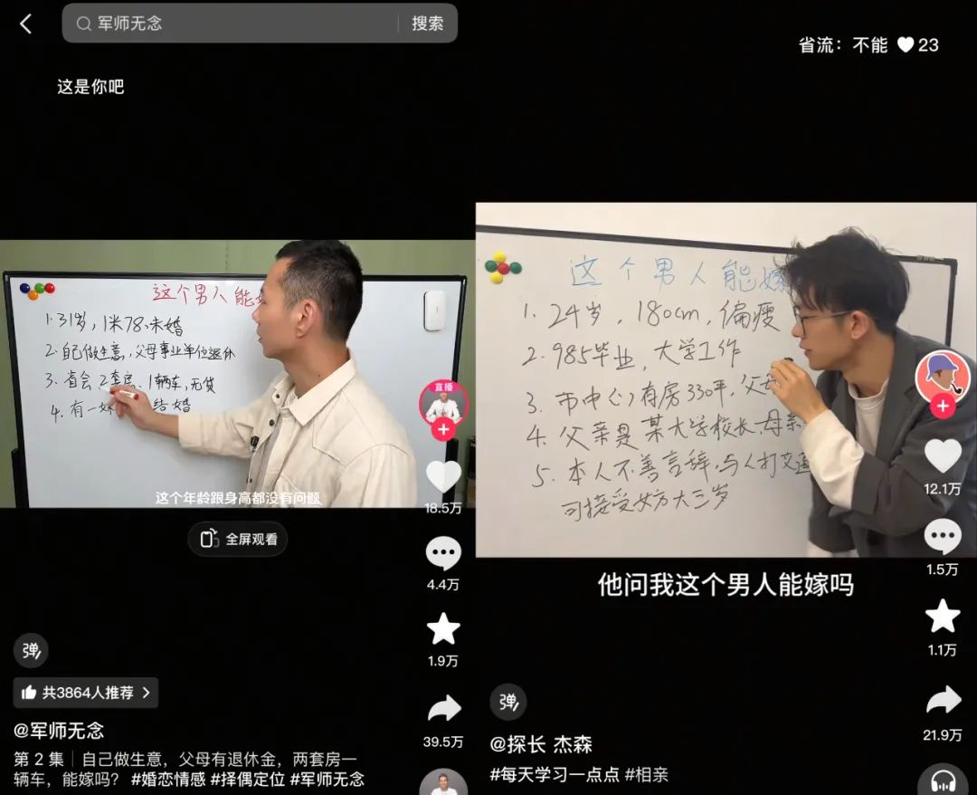 在他的視頻中,針對(duì)“年薪50萬、有房無貸”的男性,指出“未提房產(chǎn)位置暗示郊區(qū)老破小”、“收入取谷實(shí)際可能僅30萬”,引發(fā)評(píng)論區(qū)近千條互動(dòng)。這類內(nèi)容正席卷短視頻平臺(tái)。同類型創(chuàng)作者@軍師無念 單條分析“1米78生意男”的視頻獲贊18.5萬;而@探長杰森 憑借55個(gè)作品吸粉51萬,他總結(jié)的“彩禮萬能公式”被網(wǎng)友奉為相親圣經(jīng)。