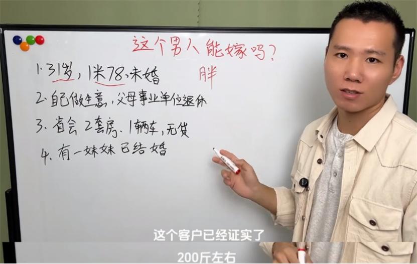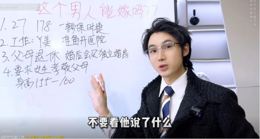 用黑板拆解打造“刑偵小劇場(chǎng)”,一塊黑板、一支粉筆,再加上一句“這個(gè)男生能嫁嗎?”這是@侃哥指男 的視頻開場(chǎng)白,如今已成為相親分析賽道的標(biāo)志性符號(hào)。他以簡(jiǎn)歷刑偵模式走紅,通過逐條拆解粉絲投稿的相親對(duì)象條件,把“優(yōu)質(zhì)男”反轉(zhuǎn)成“隱藏雷區(qū)”。