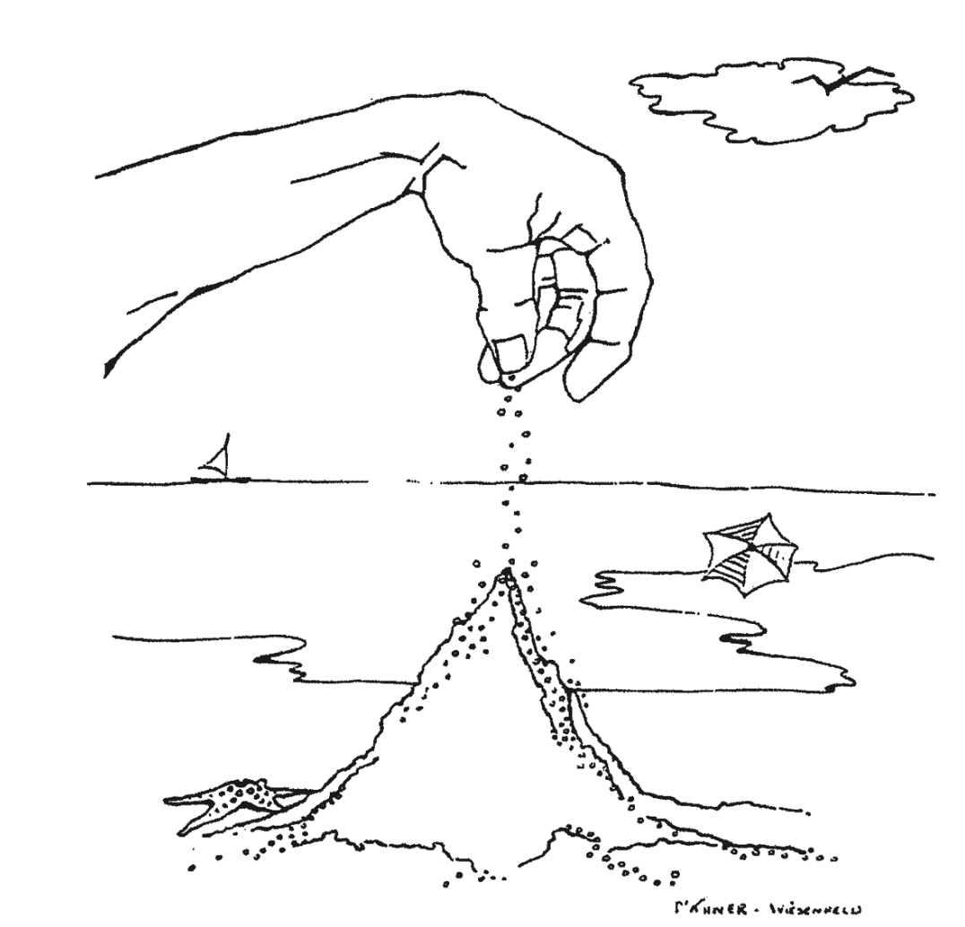 舉個生活中的例子,海灘上孩子讓沙粒緩緩落下形成沙堆。起初,沙堆是平的,沙粒停留在落下位置附近,其運動可用物理性質(zhì)解釋。隨著堆沙過程持續(xù),沙堆變陡,沙粒滑動距離增大。最終,一些沙粒的滑動能跨越整個沙堆或大部分。此時,系統(tǒng)遠離平衡,其行為不能用單顆沙粒行為描述?!氨浪陨沓蔀榱艘环N動力系統(tǒng)”,只有從對整個沙堆性質(zhì)的總體描述出發(fā)才能理解,沙堆是復雜系統(tǒng)。