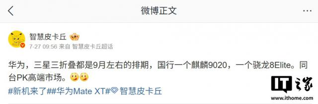 IT之家7月28日消息,博主 @智慧皮卡丘 昨日在微博透露,華為、三星的新品三折疊手機(jī)預(yù)計(jì)都將在9月左右發(fā)布。