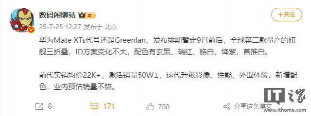 同時(shí)根據(jù)此前博主 @數(shù)碼閑聊站 的消息,華為的全新三折疊手機(jī)代號(hào)“Greenlan ”,其前臉外觀相比前代(Mate XT)變化不大,有玄黑、瑞紅、皓白、絳紫四種配色可選。Mate XT實(shí)銷(xiāo)均價(jià)2.2萬(wàn)元以上,激活銷(xiāo)量在50萬(wàn)部左右,而Mate XTs對(duì)影像、性能、外圍體驗(yàn)進(jìn)行了升級(jí),還有新配色,預(yù)估銷(xiāo)量更高。