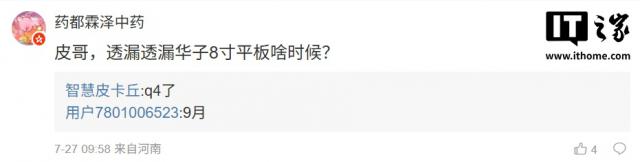 后續(xù)有用戶(hù)在評(píng)論區(qū)詢(xún)問(wèn):“皮哥,透漏透漏華子8寸平板啥時(shí)候”?博主則回復(fù)道:“Q4(IT之家注:第四季度)了”。