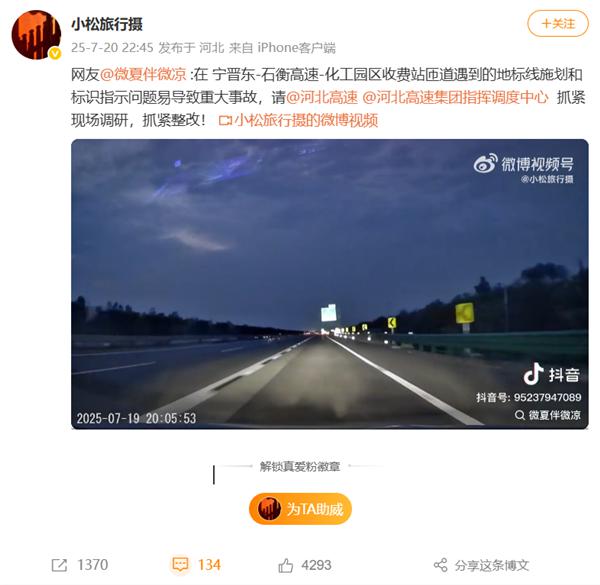 快科技7月28日消息,近日,有網(wǎng)友發(fā)布視頻指出,在寧晉東 - 石衡高速 - 化工園區(qū)收費(fèi)站匝道存在地標(biāo)線(xiàn)施劃和標(biāo)識(shí)指示問(wèn)題,這一情況極易導(dǎo)致重大事故,該網(wǎng)友希望管理部門(mén)能盡快整改。