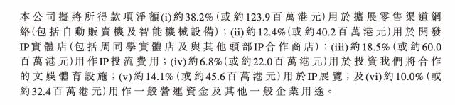 巨星傳奇稱,所得款項(xiàng)凈額的使用計(jì)劃為:約38.2%用于擴(kuò)展零售渠道網(wǎng)絡(luò),如自動(dòng)販賣機(jī)及智能機(jī)械設(shè)備;約12.4%用于開發(fā)IP實(shí)體店,包括周同學(xué)實(shí)體店及與其他頭部IP合作商店;約18.5%用作IP投流費(fèi)用;約6.8%用于投資公司將來合作的文娛體育設(shè)施;約14.1%用于IP展覽;約10%用作一般營(yíng)運(yùn)資金及其他一般企業(yè)用途。