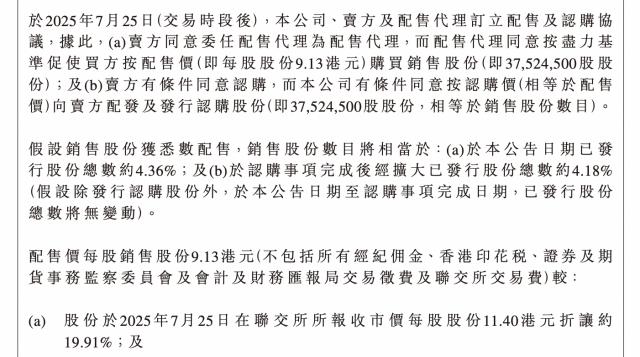 每股配售價(jià)較7月25日收市價(jià)11.4港元折讓約19.91%,新股占擴(kuò)大后股本約4.18%。