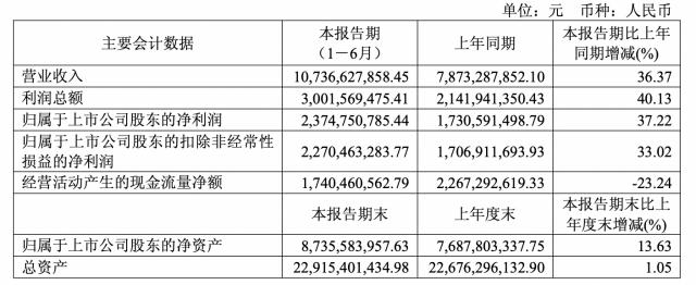 據(jù)公告顯示,公司實現(xiàn)營收107.37億元,同比增長36.37%;歸母凈利潤為23.75億元,同比增長37.22%。