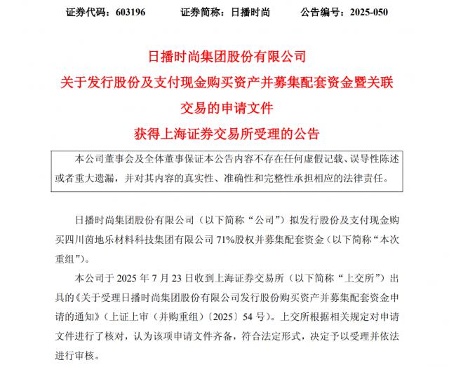 瑞財(cái)經(jīng) 趙盼盼 日播時(shí)尚在2025年7月23日收到了上交所出具的《關(guān)于受理日播時(shí)尚集團(tuán)股份有限公司發(fā)行股份購(gòu)買(mǎi)資產(chǎn)并募集配套資金申請(qǐng)的通知》(上證上審(并購(gòu)重組)〔2025〕54號(hào))。上交所依據(jù)相關(guān)規(guī)定對(duì)申請(qǐng)文件進(jìn)行核對(duì)后,認(rèn)為申請(qǐng)文件完備,符合法定形式,決定受理并依法審核。