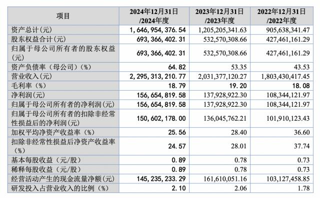 業(yè)績方面,2022 - 2024年,泰凱英實現(xiàn)營收分別為18.03億元、20.31億元、22.95億元;歸母凈利潤分別為1.08億元、1.38億元、1.57億元。