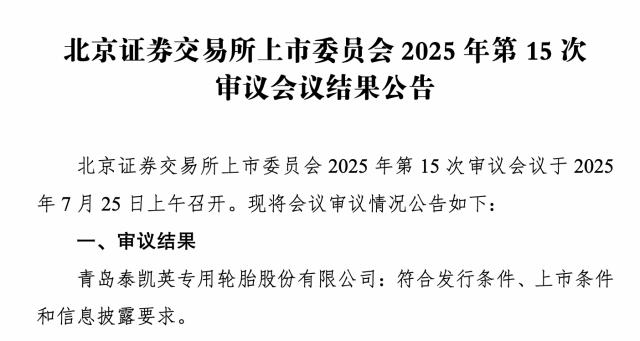 瑞財經(jīng) 吳文婷 7月25日,北交所發(fā)布消息,青島泰凱英專用輪胎股份有限公司(以下簡稱“泰凱英”)符合發(fā)行條件、上市條件和信息披露要求,其保薦機構(gòu)為招商證券。