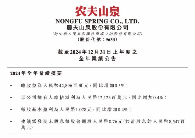 今年3月25日,農(nóng)夫山泉發(fā)布了截至2024年12月31日止年度的全年業(yè)績(jī)公告。從公告數(shù)據(jù)來(lái)看,公司實(shí)現(xiàn)總收益為428.96億元,同比增長(zhǎng)0.5%;母公司擁有人應(yīng)占溢利為121.23億元,同比增加0.4%。