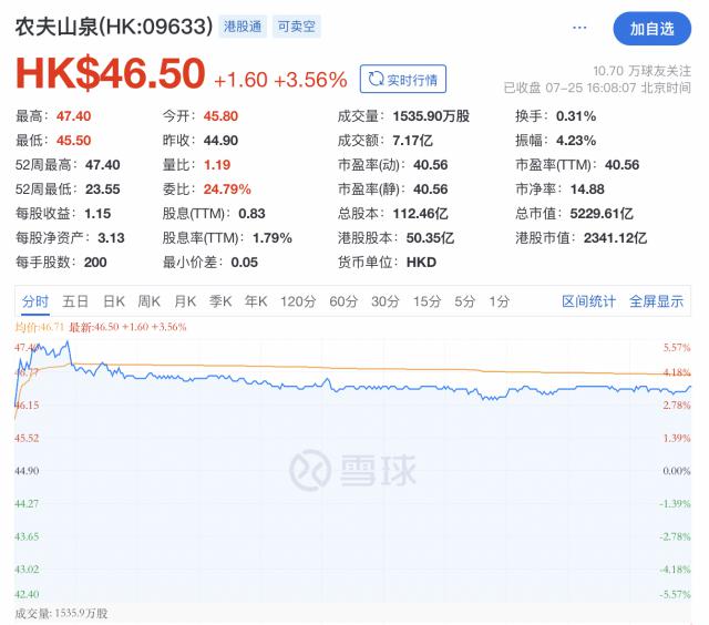 7月25日,農(nóng)夫山泉的股價(jià)有了顯著表現(xiàn),一度上漲5.57%,最高攀升至47.4港元,創(chuàng)下了2022年1月以來(lái)的新高。到當(dāng)日收盤時(shí),股價(jià)報(bào)46.5港元,漲幅為3.56%,總市值約達(dá)5229.61億港元。