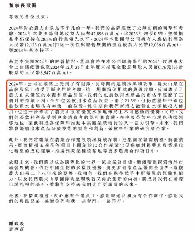 農(nóng)夫山泉?jiǎng)?chuàng)始人鐘睒睒在財(cái)報(bào)中提到,2024年公司在網(wǎng)絡(luò)上遭遇了有組織、長(zhǎng)時(shí)間的連續(xù)抹黑和攻擊,這讓農(nóng)夫山泉的品牌形象面臨了歷史性的考驗(yàn)。
