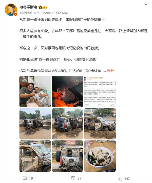 博主 @向北不斷電 昨日分享了自己與英雄車主李先生的合影、救援過程的驚險時刻現(xiàn)場視頻以及參與救援的方程豹豹5實車受損情況。