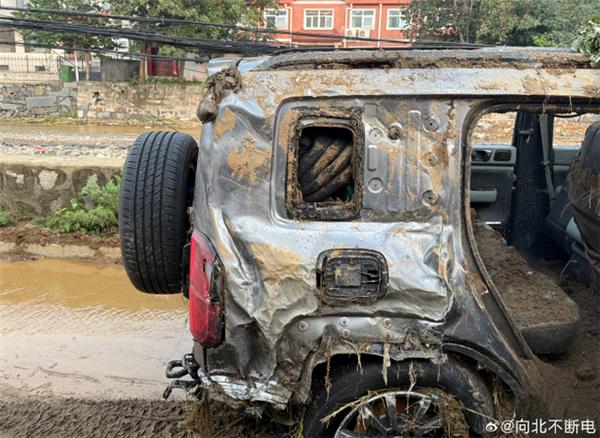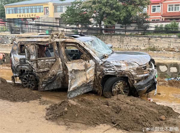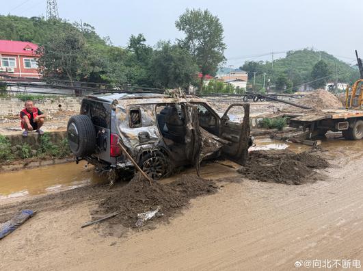 據(jù)描述,阜平縣遭遇特大暴雨,車主帶著拖車鉤想去義務(wù)救援,沒想到被突然爆發(fā)的山洪沖到了溝里。