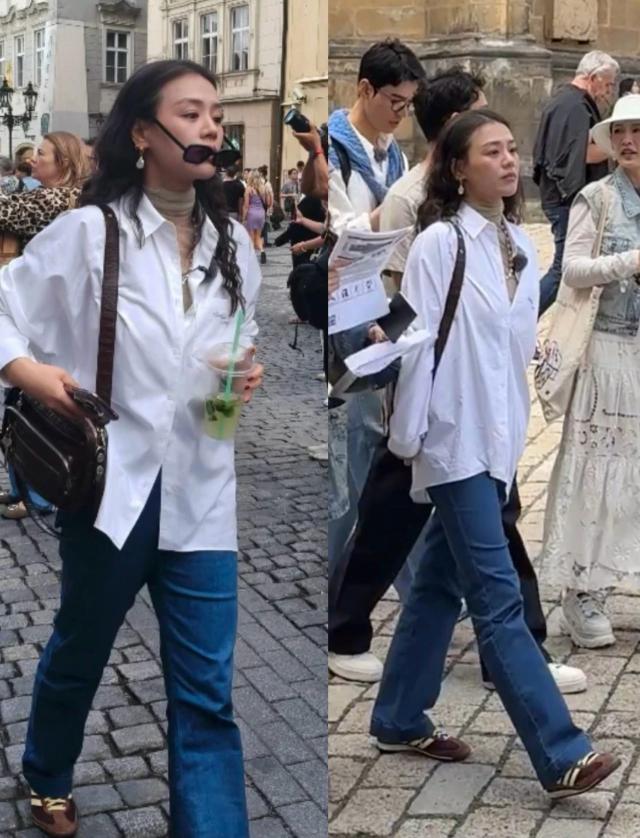 馬思純的穿搭最為松弛,一件寬松白襯衫搭配薄紗內(nèi)搭,再加上一件藍色闊腿褲就出街了。就連耳飾,她也選擇了簡約款的珍珠耳飾,一身正是當(dāng)下流行的 Clean fit 不費力穿搭。