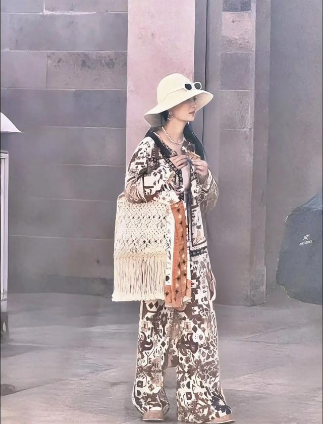 李沁換上了復(fù)古花紋長袖長褲套裝,搭配珍珠流蘇耳環(huán)和珍珠項鏈,盡顯異域風(fēng)情。在這身度假風(fēng)穿搭中,最具靈魂的單品當(dāng)屬那個淺色手工編織鏤空流蘇包包。