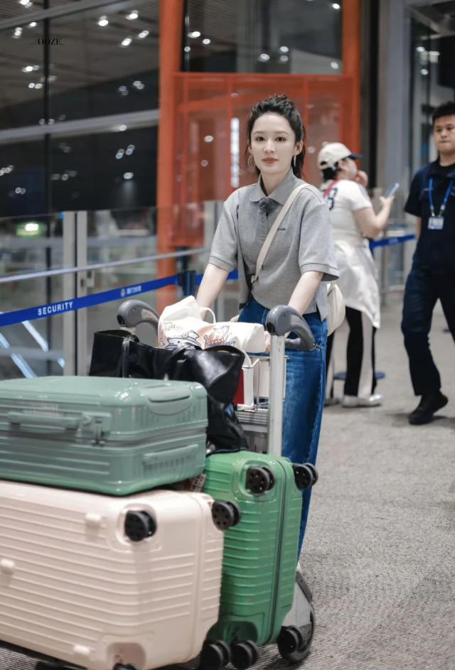 李沁身穿一件 WE11DONE 灰色短袖 Polo 衫,搭配闊腿彎刀牛仔褲,整體干凈清爽。