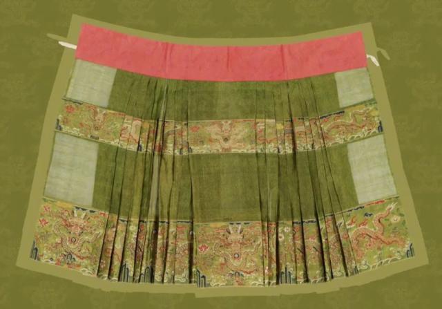 實際上,交領(lǐng)上襖和馬面裙是有文物依據(jù)的,像我們熟知的孔府舊藏文物等。明代的馬面裙前門樣式更簡潔,裙擺寬大,根據(jù)用料和打褶方式不同,有H擺和A字?jǐn)[。馬面裙下擺常裝飾有豐富的裙襕,常見橫向分布的底襕或膝襕,紋飾多是帶有吉祥寓意的圖案。