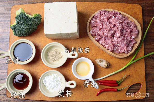 所需食材有老豆腐、豬肉餡、西藍(lán)花、小米椒、姜、蔥、香油、生抽、蠔油、白胡椒粉、玉米淀粉、鹽、油。