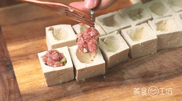 如果選用的肉餡比較瘦,可以把挖出的豆腐搗碎后混入肉餡中,這樣口感會(huì)更嫩滑,肉餡也不會(huì)那么干柴。