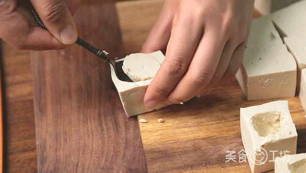 3. 把豆腐切成方塊,在中心挖個(gè)洞。