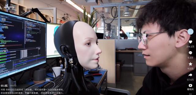 在抖音上,能更直觀地感受U航獲獎(jiǎng)?wù)撐牡镊攘Α?月13日,U航在抖音賬號(hào)首發(fā)名叫“Emo”的人臉機(jī)器人。7月14日,在最新視頻里,U航給Emo的眼睛下點(diǎn)了一顆淚痣,仿佛為其注入靈魂,面對(duì)“創(chuàng)造者”,Emo流露出困惑好奇的神情,宛如真正有了生命。