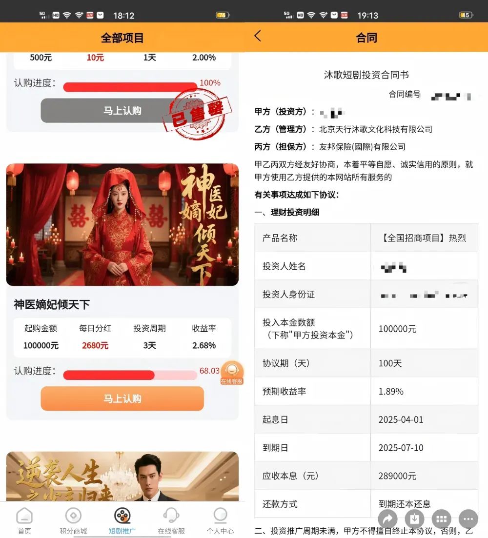 據(jù)澎湃新聞報道,“沐歌短劇”APP通過微信公眾號打廣告,宣稱簽到送現(xiàn)金、積分兌禮品。用戶下載后,APP彈出大量短劇投資項目,起購資金幾千到幾萬元不等。
