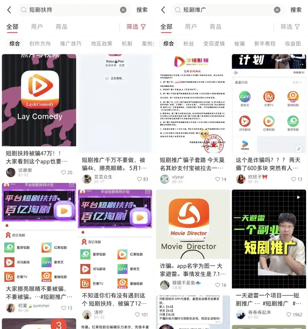 在小紅書搜索“短劇扶持”“短劇推廣”,大量用戶曝光被騙經(jīng)歷,多與李妍遭遇的騙局相似,且被騙時間大多集中在近幾個月。