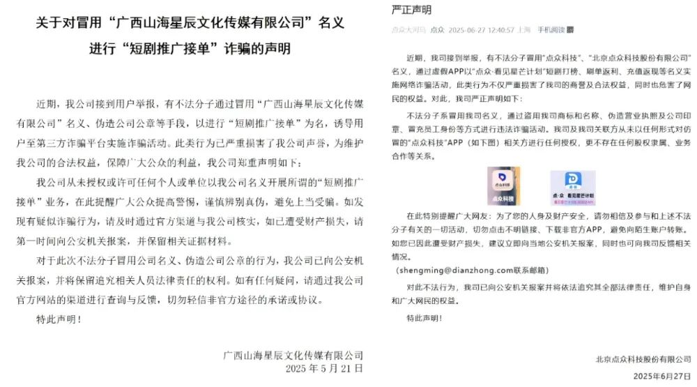 山海聲明中提到,不法分子冒用其名義,以“短劇推廣接單”誘導(dǎo)用戶到第三方平臺詐騙;點(diǎn)眾也聲明,不法分子冒用其身份,通過虛假APP以“點(diǎn)眾·看見星芒計劃”短劇打榜、刷單返利、充值返現(xiàn)等名義實施網(wǎng)絡(luò)詐騙。