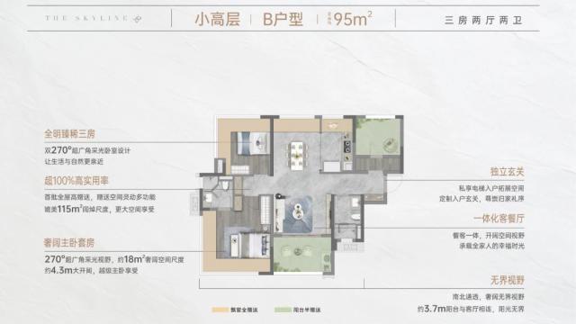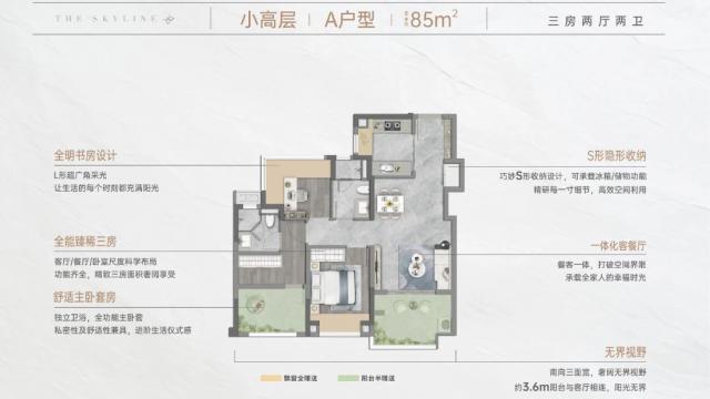 從戶型上看,作為片區(qū)少有的執(zhí)行新規(guī)的戶型,相較于舊規(guī)實現(xiàn)了空間尺度的大幅提升。項目大部分戶型使用率超100%,建面約85 - 143㎡的全生命周期戶型,涵蓋新婚夫婦、三口之家到三代同堂等多種家庭結(jié)構(gòu),900余戶房源能精準(zhǔn)滿足不同家庭的安家需求。