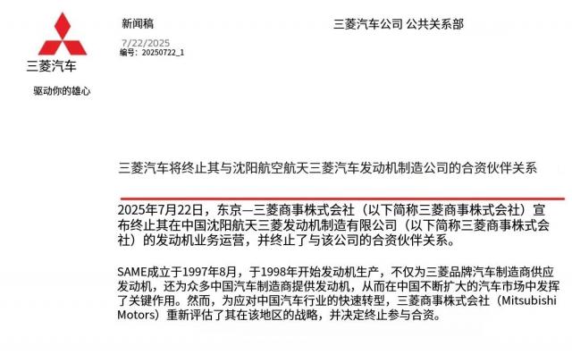 2025年7月22日,三菱商事株式會社宣布終止沈陽航天三菱發(fā)動機(jī)制造有限公司的業(yè)務(wù)運(yùn)營,撤資退出。