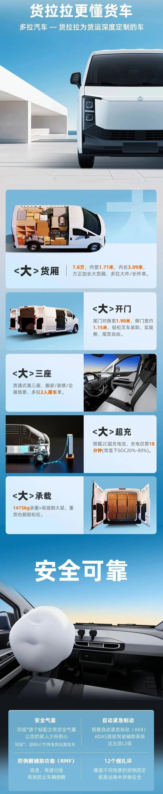 作為國內專業(yè)貨運平臺的定制車型,“多拉大面”精準把握貨運行業(yè)痛點,產品優(yōu)勢針對性強。寬大貨箱、大開度貨艙門、三座設計、12 個捆扎環(huán)等設計,保障了貨物裝載性;2C 超充電池保證了車輛補能效率,真正實現(xiàn)了“多拉快跑”。