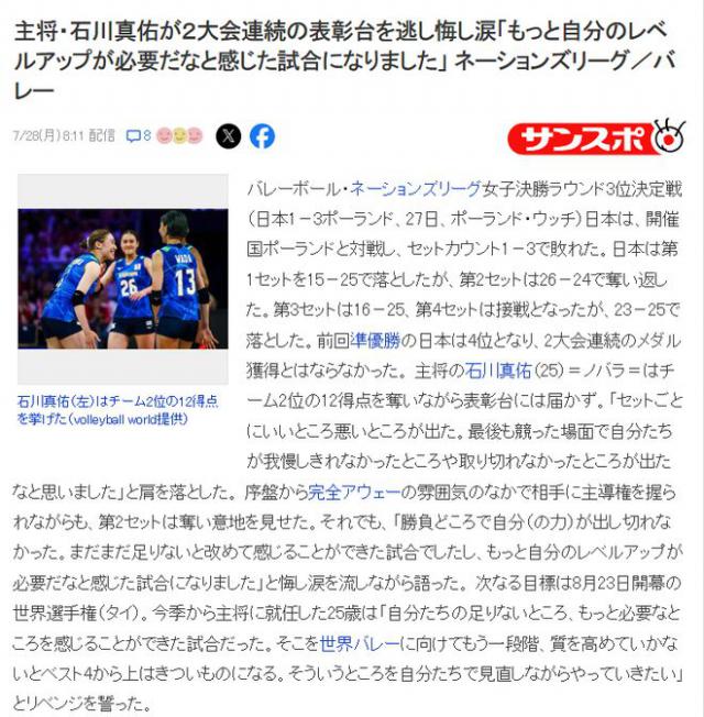 據(jù)日本媒體報道,日本女排隊長石川真佑在采訪中痛哭流涕。她一邊哭一邊說:“很遺憾沒能站上領(lǐng)獎臺,每場比賽都有好有壞。在完全客場的氛圍中,我們打得很畏縮,這場比賽感覺差距巨大,我們的能力根本沒發(fā)揮出來,從第二局開始,我們的意志力就減退了。”
