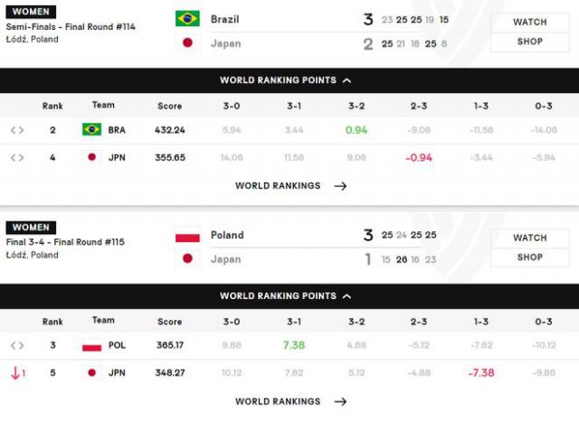 這場比賽對日本女排而言十分沉重。進入四強后,她們接連輸給巴西(2 - 3)和波蘭(1 - 3),兩場比賽的凈勝分分別為 - 0.94、 - 7.38,合計 - 8.32。這一結(jié)果使日本隊的世界排名從第四掉到了第五。