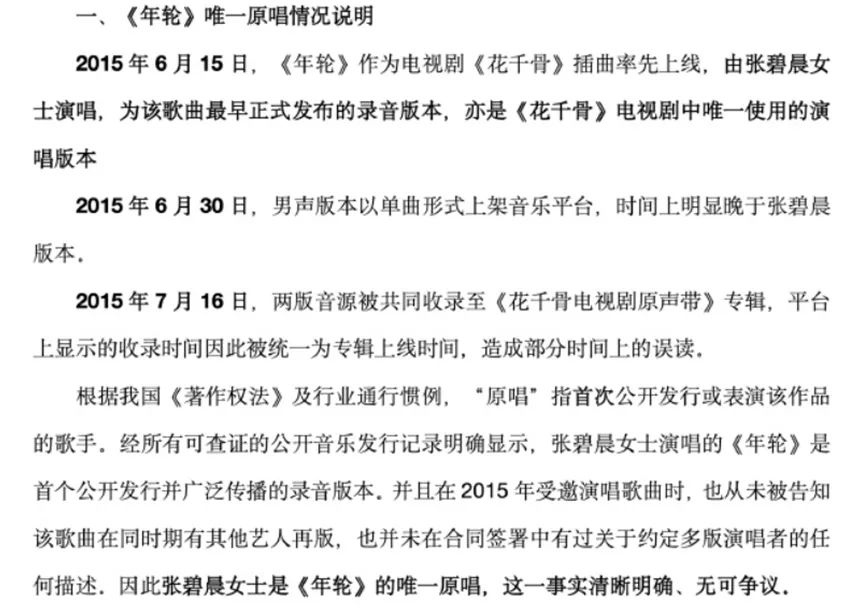 隨后,張碧晨工作室發(fā)文表示,所有可查證的公開音樂發(fā)行記錄顯示,張碧晨演唱的《年輪》是首個公開發(fā)行并廣泛傳播的錄音版本。2015年受邀演唱時,未被告知同時期有其他藝人再版,合同中也無多版演唱者的約定。因此,張碧晨是《年輪》的“唯一原唱”。不過,工作室認可《夢幻誅仙》為“雙原唱”歌曲,認為其與《年輪》情況不同。