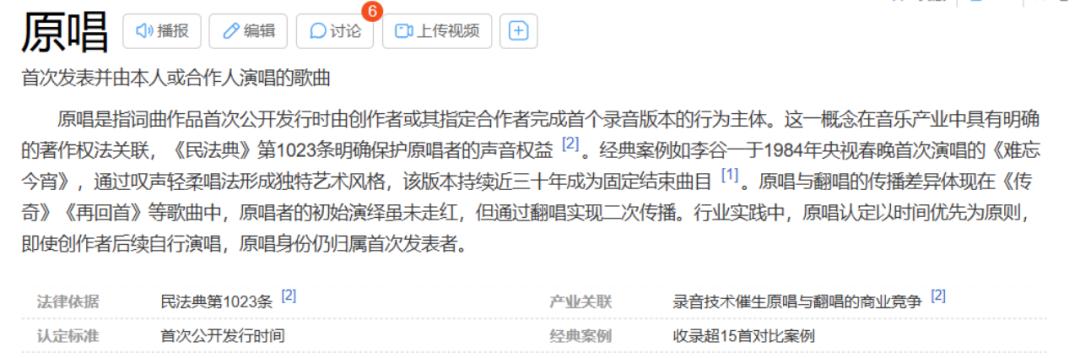 百度百科的“原唱”定義并非《民法典》規(guī)定。實際上,《民法典》和《著作權(quán)法》中都沒有“原唱”一詞的明文規(guī)定?!吨鳈?quán)法》中的署名權(quán)和表演者的表明身份權(quán),與“原唱”沒有直接關(guān)聯(lián)。百度百科詞條和張碧晨工作室聲明中提及的“法律依據(jù)”說法缺乏依據(jù)。所以,“原唱”的定義更多要通過市場認知和行業(yè)慣例來界定。