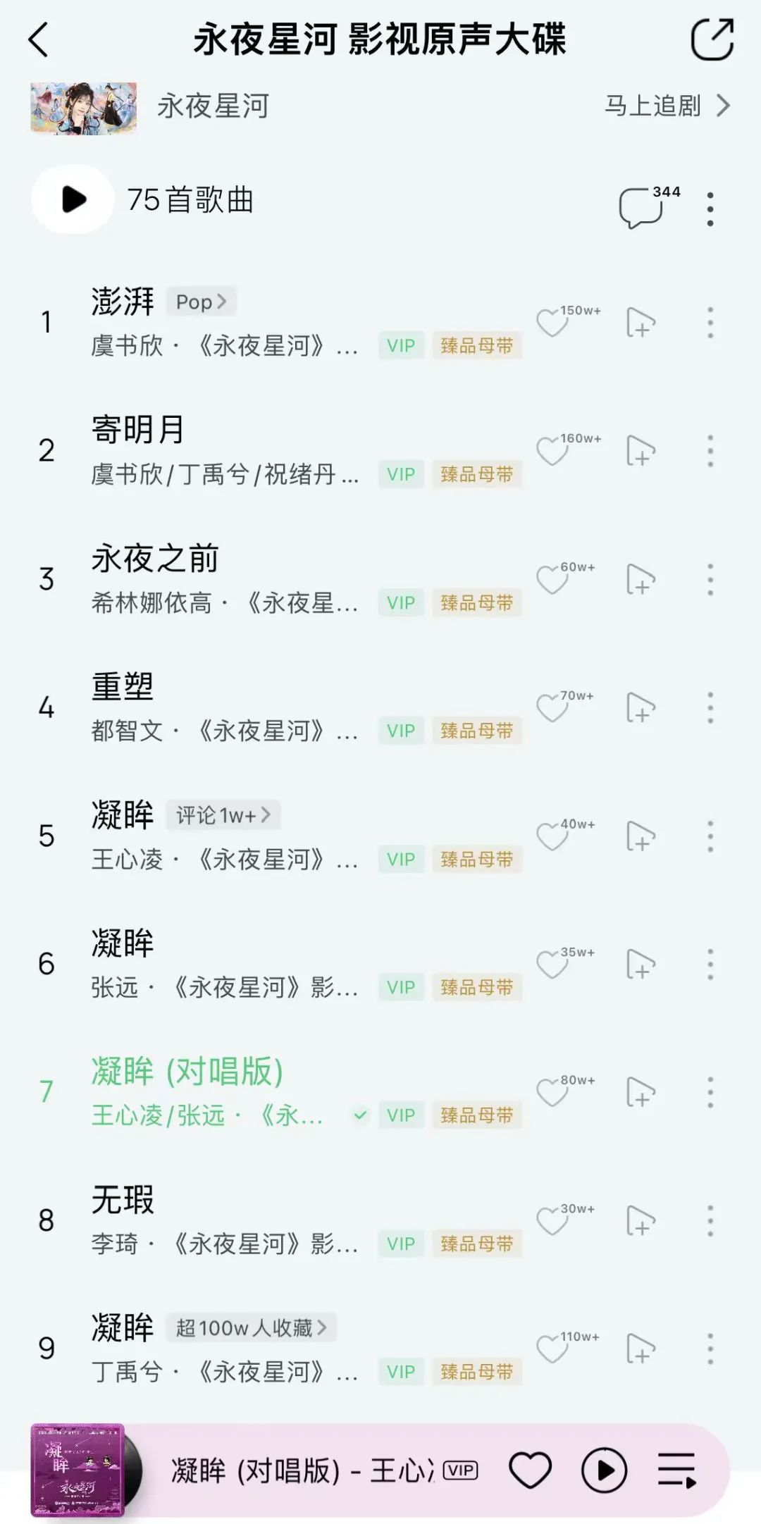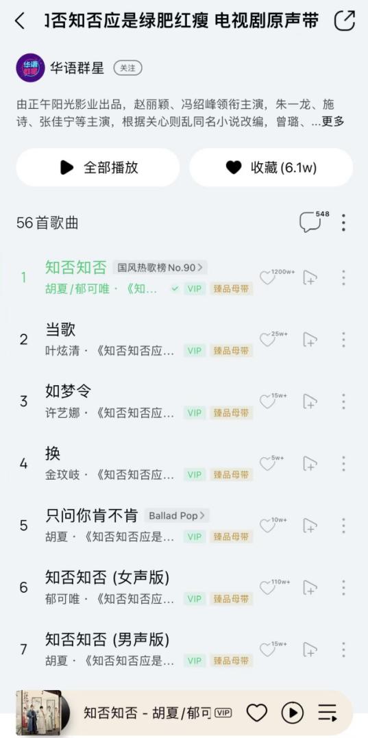 在影視劇OST中,常出現(xiàn)“雙原唱”甚至“多原唱”情況。比如《知否知否應(yīng)是綠肥紅瘦》OST中的《知否知否》,有胡夏/郁可唯版本、郁可唯女聲版以及胡夏男聲版;《永夜星河》OST中的《凝眸》,有王心凌版本、張遠版本、王心凌/張遠對唱版本以及丁禹兮版本。