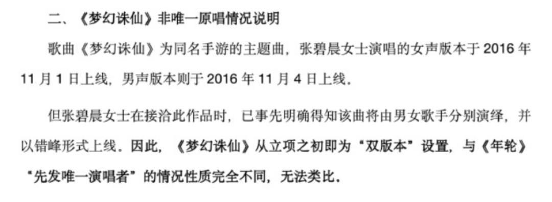 我們看看張碧晨工作室關(guān)于認可“雙原唱”的《夢幻誅仙》的說法。