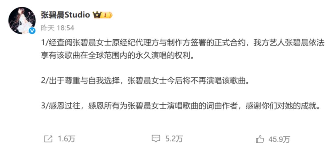 輿論發(fā)酵后,張碧晨工作室發(fā)博稱“張碧晨依法享有該歌曲在全球范圍內(nèi)的永久演唱的權(quán)利”,并且表示“今后將不再演唱該歌曲”。