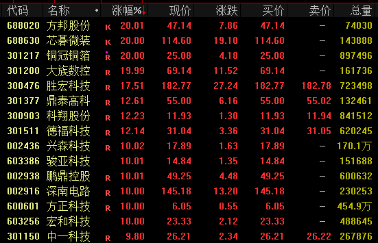 PCB概念盤中走勢活躍。截至收盤,方邦股份、芯碁微裝、銅冠銅箔、大族數(shù)控20%漲停;勝宏科技漲超17%,盤中創(chuàng)歷史新高。